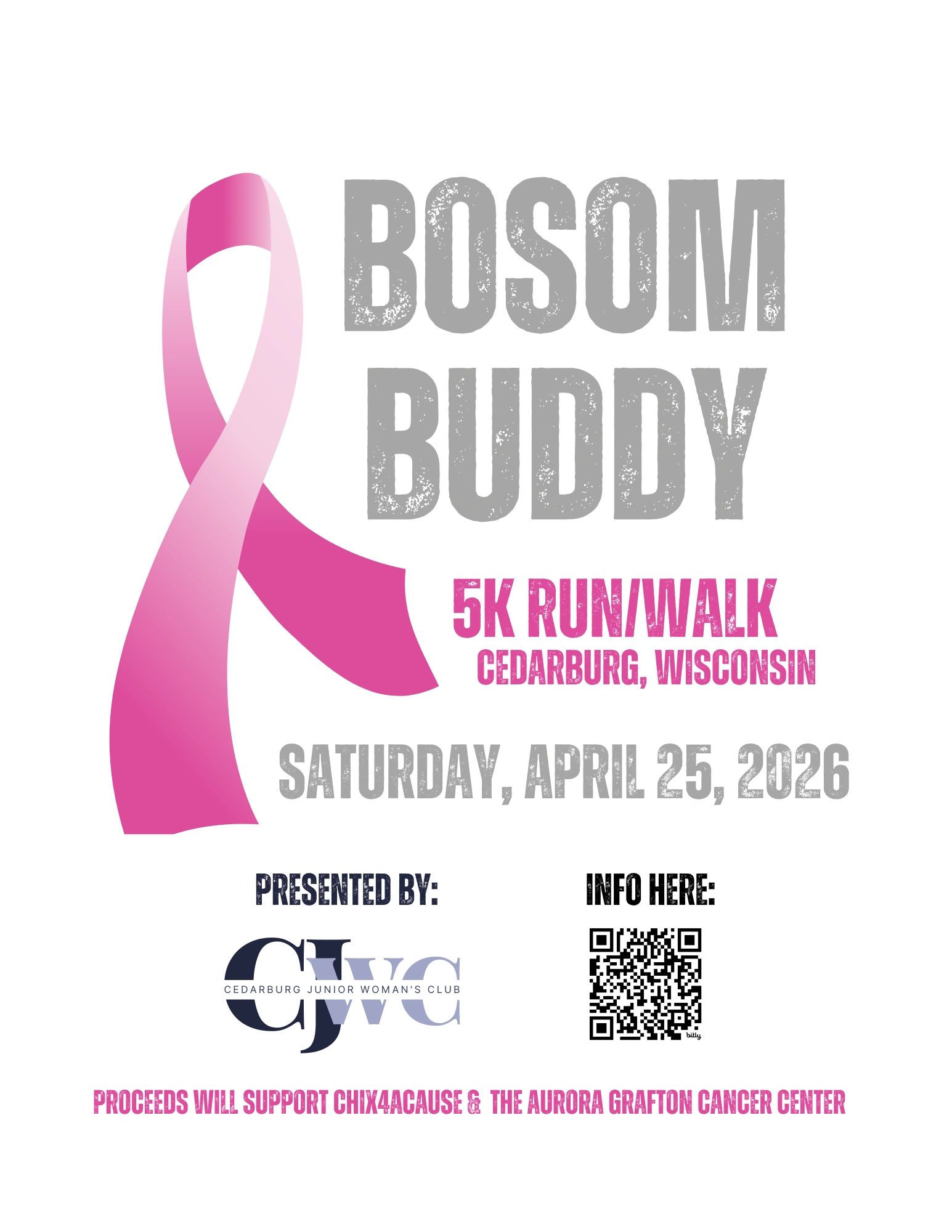 CJWC's Annual 5k Bosom Buddy Run is a 5k run/walk. Proceeds will be donated to local breast cancer support groups.
